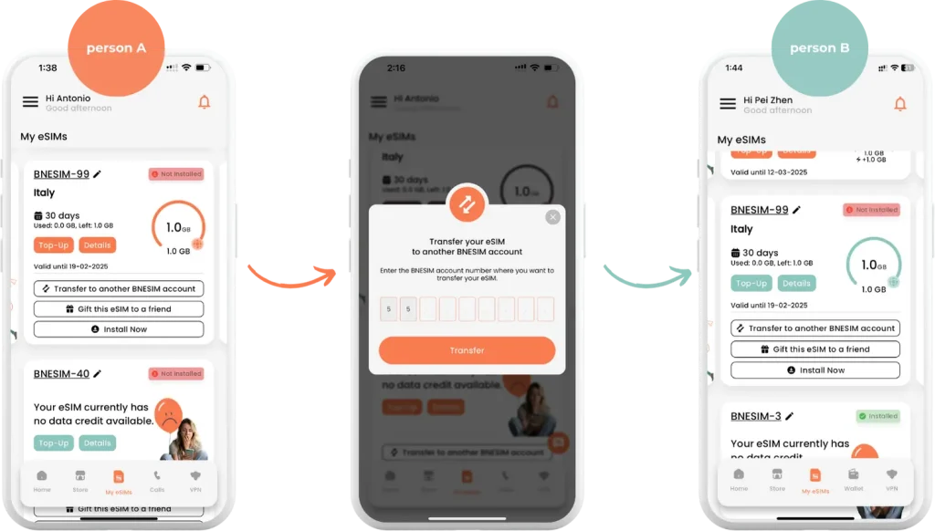 Trasferisci facilmente un'eSIM a un altro account BNESIM, pronta all'uso immediato.