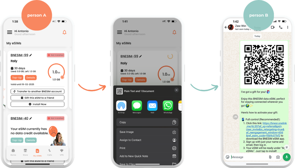Tocca "Regala questa eSIM a un amico" e condividi il QR code. Il destinatario può scansionare per attivare subito oppure scaricare l'app BNESIM per gestire l'eSIM ricevuta con controllo completo.